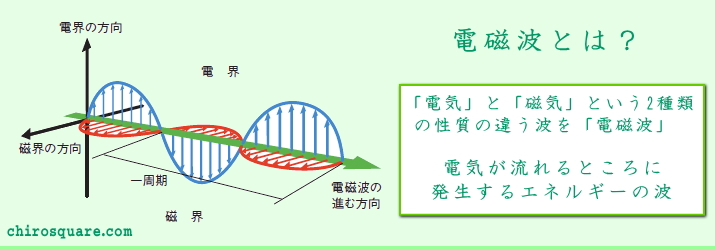 電磁波とは、「電場(電界)」と「磁場(磁界)」と「周波数」をひとつにした言葉です。