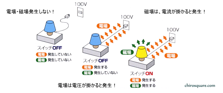 家電製品を使うとき、「電場」はコンセントに電源プラグを差し込んだ時点で発生しますが、「磁場」はスイッチをオンにする まで発生しません。