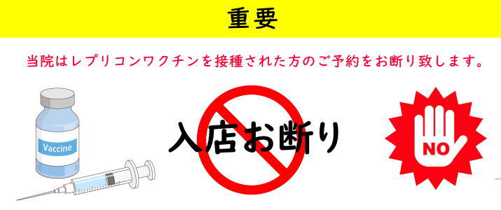 現時点で、このレプリコンワクチンの安全性は十分に確認されていないため、当院ではレプリコンワクチンを接種された方のご来院及びご予約をお断りさせて頂く事となりました。