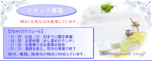 ●応募資格・・・カイロ、リラクゼーション、柔道整復師、アロママッサージ、エステテシャンなど。